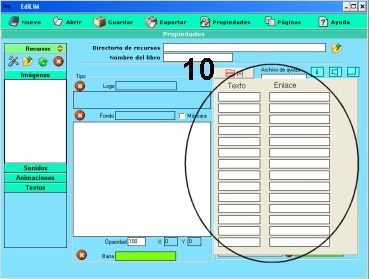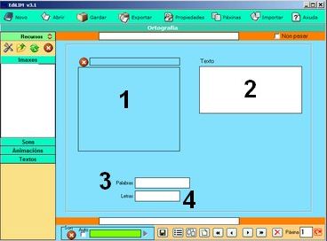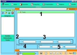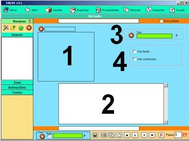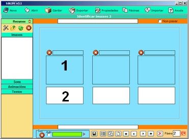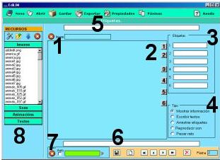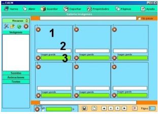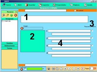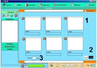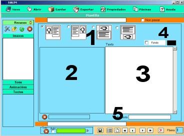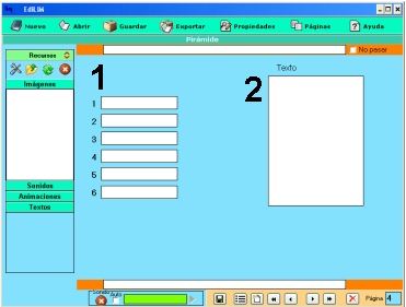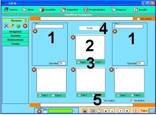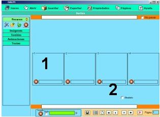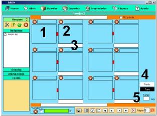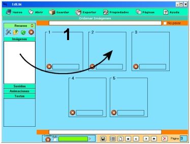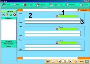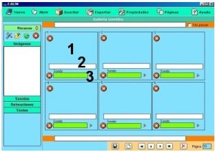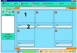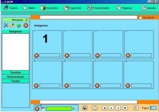 Los elementos multimedia que utilizaremos deben estar en el almacén de recursos. Éstos aparecen catalogados en cuatro grupos: imágenes (jpg,png y gif ), sonidos (mp3), animaciones ( swf) y textos ( html y txt ). Apretando en el botón correspondiente edilim muestra los archivos de cada categoría. Arrastre los archivos hasta los marcos de imagen o casillas de texto/imagen/animación.